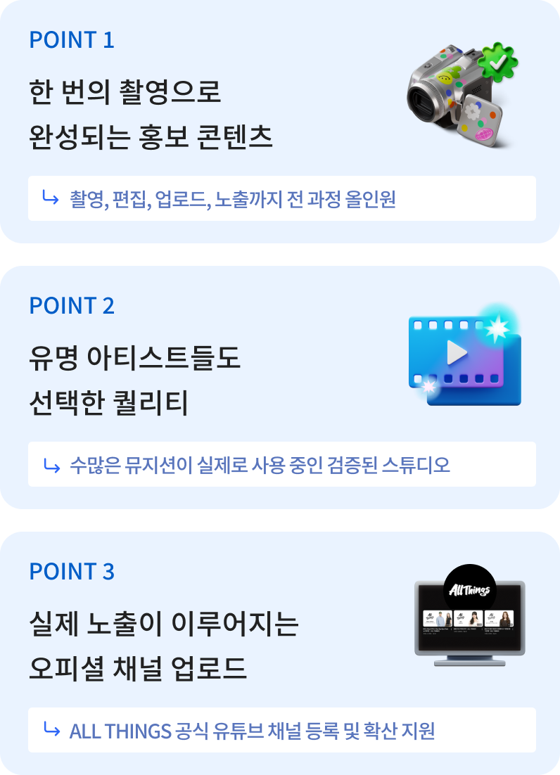 유튜브, 메타(인스타그램/페이스북), 틱톡 등 플랫폼 기반 광고, 음감사X뮤직카우, 매장음악송출, 플릭 플레이리스트, 라이브 콘텐츠 촬영 등 원하는 유료 프로모션 선택이 가능하며, 예산, 기간으로 신청할 수 있습니다.